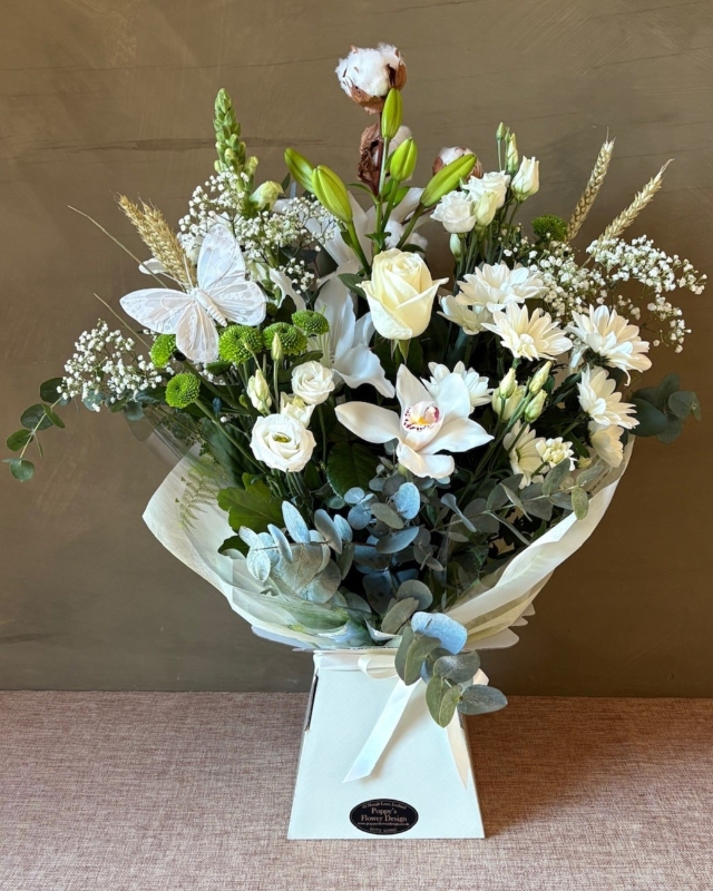 Featuring a serene mix of white blooms, hints of green, and fragrant eucalyptus, this arrangement is effortlessly stylish.