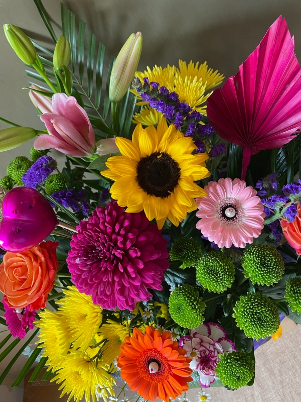 This very large bouquet, complemented by lush greenery and playful fillers, bursts with colour and energy, making it a dazzling and joyful centrepiece perfect for any celebration.