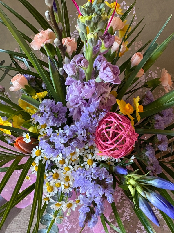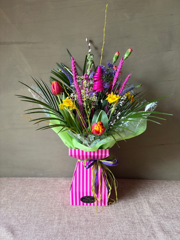 This carefully crafted bouquet features a mix of seasonal blooms, including tulips, scented narcissus, and eucalyptus, bringing a natural, airy feel.