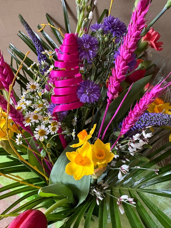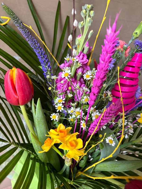 A petite, spring-inspired hand-tied arrangement in water full of fresh textures and vibrant colours.