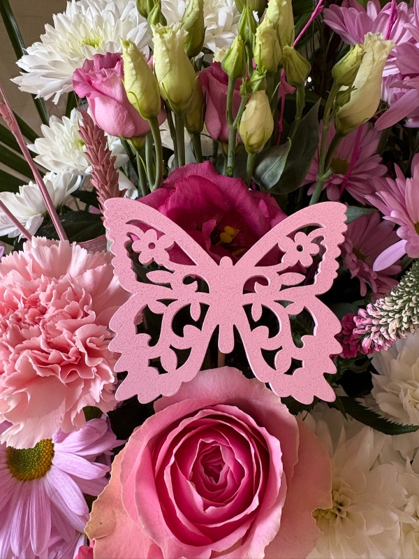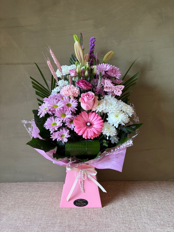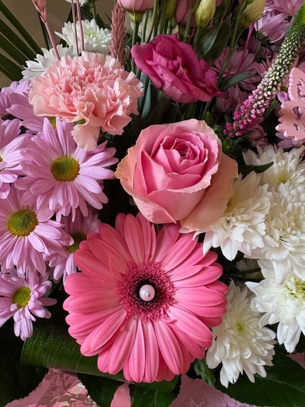 Pink Pearl is a feminine and delicate arrangement featuring soft pink tones paired with light neutrals and gentle greenery.