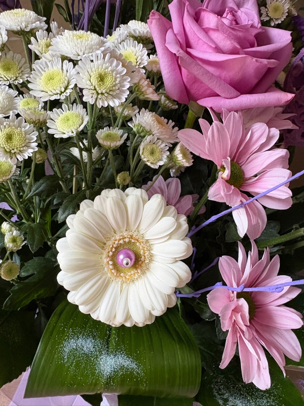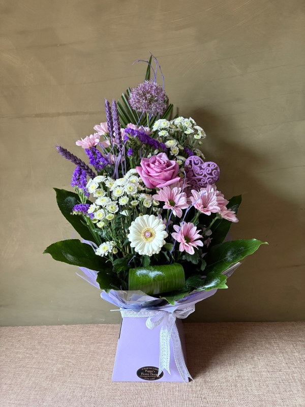This thoughtful arrangement brings together gentle colours and textured blooms to create a calming, elegant display.